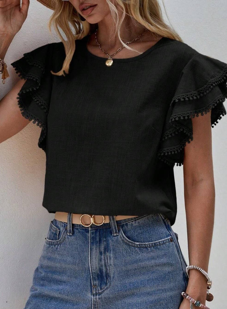 Crewneck Loose Lace Ruffle Short-Sleeved T-Shirt Top: Black