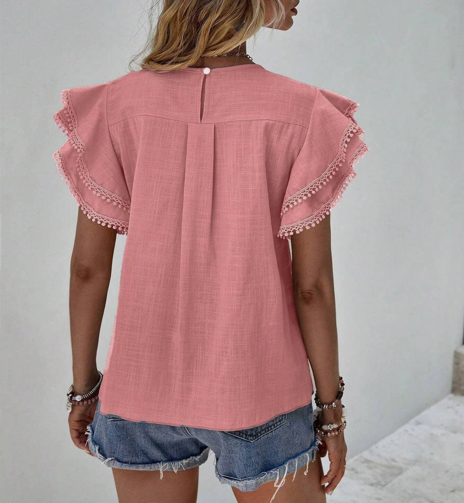 CREWNECK LOOSE LACE RUFFLE SHORT-SLEEVED SHIRT.